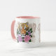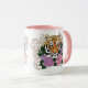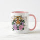 Portrait tigre aux fleurs rose et violet clair. Du henné tout autour du tigre dans un décor de vert.