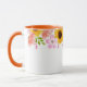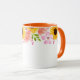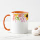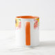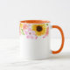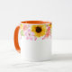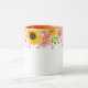 Ce mug floral à deux tons présente de jolies fleurs estivales de roses sauvages roses, de pavots coraux et de tournesols joyeux autour du bord supérieur du mug. La poignée et l'intérieur représentés sont orange.