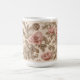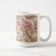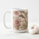 Un doux enveloppement de tasse rose dans des tons calmes de rougeur, de crème et de taupe, avec des feuilles défilés.