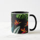 Un arrière - plan noir chic. Forêt tropicale verte et bleue, jungle. Palmier et feuilles de banane, feuillage aux fleurs rouges et oranges, fleurs. Un cadre noir et orange avec espace pour votre nom et lettre monogramme. Le nom est écrit avec un script de style moderne écrit à la main.