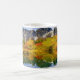 Une tasse avec une belle photo de campagne. Montagnes de pierre avec une forêt automnale aux couleurs vives. Un lac tranquille reflète les montagnes, les arbres et les herbes.