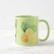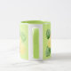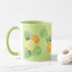Cette tasse à café à deux tons a des illustrations aquarelles de tranches d'oranges, citrons et citrons contre un arrière - plan vert solide. L'intérieur de la tasse et la poignée sont également verts.