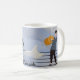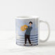 Beside him, a grand full note and a gentle bass clef set the tone, reminding you that every sunrise has its own melody. The soft blue hues echo calmness, while the lively energy of the scene brings a smile with every sip.