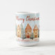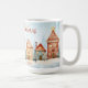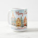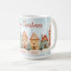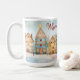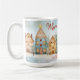 Une charmante petite rangée de maisons en pain d'épice entoure cette tasse de Noël amusante. L'aquarelle joyeuse est d'origine vintage. La scène hivernale enneigée inclut "Joyeux Noël" dans la coordination du script brun rouge que vous pouvez modifier. Assurez-vous de modifier les noms "de" et aussi la date de ce cadeau de vacances personnalisé.
