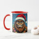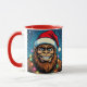 A funny Sasquatch personalized Christmas coffee mug with a comic book style pop art sasquatch smiling with a Santa and Christmas lights on.