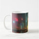 A vibrant city skyline with towering skyscrapers bathed in neon lights reflecting in water. The central structure is highlighted with a warm glow.