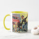 Illustration vintage image d'enfant montrant une étudiante qui travaille comme agent de patrouille de sécurité et qui agit comme gardienne de passage à niveau pour arrêter des voitures pour aider une fille qui a déposé son déjeuner au carrefour sur le chemin de l'école le matin. Il ramasse une pomme dans une main et arrête la circulation avec l'autre. Un conducteur dans un semi-camion attend patiemment.