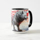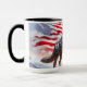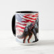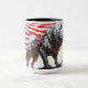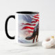 La composition de l'image est dramatique, avec le loup au centre, dégageant une aura de loyauté et de courage inébranlables. Le drapeau, aux couleurs rouge, blanc et bleu, symbolise la liberté et la fierté nationale, accentuée par la noble position du loup. Le terrain montagneux ci-dessous ajoute à la nature épique de la scène, suggérant que le loup se tient comme un sentinelle sur la terre, vigilant et protecteur. L'ambiance générale de l'oeuvre est celle de la force, du patriotisme et de la majesté naturelle, ce qui en fait une pièce inspirante et évocatrice qui parle à l'esprit de liberté et au pouvoir durable de la nature.