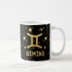 Tasse personnalisée pour "Gemini" avec symbole zodiaque doré, étoiles dorées, et arrière - plan noir terreux.