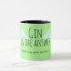 Cette tasse est idéale pour toute personne qui aime boire du gin. Il a un arrière - plan vert vif avec les mots, en noir, "Gin est la réponse. Quelle était votre question ?" La tasse est décorée de deux verres de gin et de tonique avec de la glace et du citron.