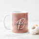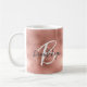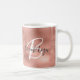 Cette élégante tasse à café personnalisée présente son monogramme et son prénom dans un script moderne blanc et gris fusain, sur un arrière - plan brillant de fausse feuille et de parties scintillant or rose.