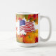 Un design d'automne très coloré avec feuille et citrouille, et la bannière étoilée vole fièrement. Les lettres USA apparaissent à l'arrière de la tasse.
