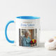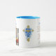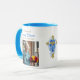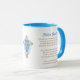 A beautiful coffee mug memorial keepsake for funerals, celebration of life gatherings or to send to friends and family in honor of someone they lost. You can add a photo in the personalized area. The back has a religious poem for comfort to remind you your loved one is in God's arms now. The accent colors used are blue and gold. There is a golden cross with blue flowers on it too.