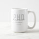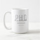 Une grande tasse de doctorat qui indique le nom du diplômé, le domaine d’études et la date de fin d’études. La tasse inclut le nom dans une police de script d'écriture manuscrite et un design noir et gris. C’est un grand plaisir pour un gardien ou une fête. Ajoutez simplement les infos du diplômé, ajoutez cette tasse à votre panier, et félicitations pour cette étape majeure ! Graduate Keepsaké Black Grey Nom PhD Large Coffee Mug Conception de jour férié | ©Melissa Patton - Designer