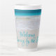 Grand mug à latte avec scène de plage et citation. Exemple de texte, sur deux lignes, « Accueillez le matin au bord de la mer » en écriture bleue, imprimé sur du sable lisse. Changez-le facilement comme vous le souhaitez. L'eau bleu turquoise au loin et les petites vagues qui lapent le rivage en font la tasse idéale pour la maison de plage.