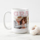 Create a keepsake photo collage coffee mug for a grandmother with 3 pictures, the title GRANDMA in editable blush pink with a modern handwritten script with hearts typography I LOVE YOU design overlay in gray and personalized with your custom text accented with hearts. CHANGES: The personalized text font style, color, size and placement as well as the GRANDMA graphic title color and background color can be changed in the EDIT menu. ASSISTANCE: For help with design modification or transfer, contact the designer via Zazzle Chat or email makeitaboutyoustore@gmail.com.