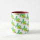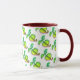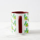 Green leaves with reddish highlights, are multiplied across the mug. Reddish stem supports 3-d looking leaf in shades of green.