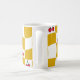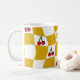 Transport yourself back to the groovy 70s with this vibrant distorted checkerboard mug design. Featuring a playful pattern of sunny mustard yellow and crisp white squares, interspersed with adorable cherry motifs, this mug is a perfect nod to the kitsch kitchen aesthetic of the era. Its retro charm makes it an ideal addition to your morning coffee ritual or a delightful accent piece of dopamine decor for your home. Enjoy a touch of nostalgic fun with every sip. Mom is editable for short names or initials.