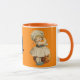 Tasses d'Halloween avec une Vintage Ellen Clapsaddle Carte postale d'Halloween image d'une petite fille mignonne en robe désuète, sculptant une pomme et jetant le peal sur son épaule pour la chance. À partir d'un jeu où le peal était d'épeler le nom ou les initiales de l'enfant fiancé futur.