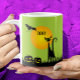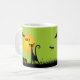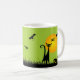 Les chauves-souris dans le ciel volent au-dessus d'un chat noir aux yeux verts et levant une lanterne de valet sur cette tasse à café Halloween. CORRESPONDANCE d'objets dans notre collection.