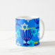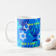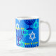 Cette tasse a un design Hanoukka de menorahs et étoiles sur un arrière - plan bleu. Idéal pour la saison.