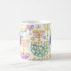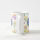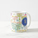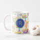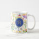 Cette tasse à café de vacances personnalisée dispose d'un motif chic d'or, menorah vert et violet et l'étoile d'or de David sur un arrière - plan blanc. De chaque côté se trouve un cercle bleu arboré d'or pour votre monogramme initial à personnaliser. Bois dans le style ! Conçu par un artiste de renommée mondiale ©Tim Coffey.