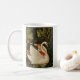 Illustration vintage de Gretel chevauchant un grand cygne blanc. Hansel se tient au bord de l'eau en regardant sa soeur. Illustration d'un livre d'enfant à l'ancienne dans le domaine public.