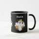 Une tasse avec l'illustration d'un fantôme souriant. Décoré de fleurs, arcs-en-ciel et chauves-souris.