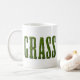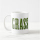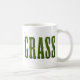 Tasse à café avec le mot GRASS. Le texte est fait d'une photo d'herbe pour lui donner l'air d'être coupé de terre. Belle conception pour les entreprises de tondeuse ou d'entretien de pelouse.