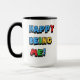 Bright joyeux Mug avec blanc arrière - plan couleurs primaires "Happy Being Me" avec poignée noire et intérieur Mug.