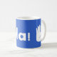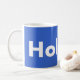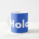 L'arrière - plan bleu célèbre avec "Hola" a imprimé dans le blanc et la main de ondulation sur le côté.