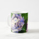 Une photographie d'hydrangeas bleus et violets sur une tasse à café.