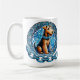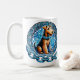 Illustration artistique avec un chien de terrier au milieu d'un arrière - plan décoratif bleu orné, symbolisant le charme et la créativité. Parfait pour les dessins animés, les collections d'art et les objets décoratifs à thème.