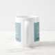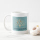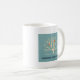 Une tasse personnalisée avec un arrière - plan vert muet superposé est un arbre jaune clair avec 2 silhouettes d'oiseau orange sur les branches.