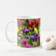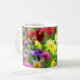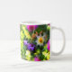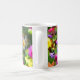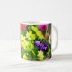 Cette tasse artistique et décorative est recouverte de fleurs de toutes les couleurs de l'arc-en-ciel. Profitez du motif fleuri jaune, orange, rose, rouge, bleu, violet et blanc posé sur un arrière - plan de feuilles verts. En regardant cela, on se rappelle d'une peinture impressionniste française.