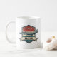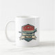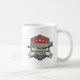 Cette tasse personnalisée de style rétro présente l'avion iconique F-4 Phantom sur un emblème patiné décoré de bandes rouges, blanches et bleues audacieuses, d'étoiles et d'un ruban pour un nom personnalisé.