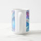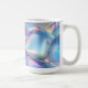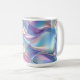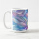 Un design géométrique métallique, bleu, orange, or et violet irisé, parfait pour une tasse de café.