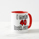 Grappige mok. Leuk voor je 40ste verjaardag. Laat zien hoe goed je er uit ziet op je veertigste verjaardag! Ook leuk om rendus te geven aan iemand die veertig est geworden. Kleuren : zwart, wit en rood.