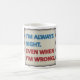 Tasse comportant la conception avec le texte "j'ai toujours raison. Même lorsque j'ai tort" en bleu et rouge.