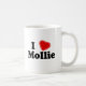 J'aime des Mollie ! Votre nom est-il des Mollie ? Avez-vous un mari, un ami, un membre de la famille masculin ou un ami de mâle que vous savez des amours vous ? Ou avez-vous une épouse, une amie, un membre de la famille féminin ou un ami féminin appelés Mollie que vous aimez profondément ? Si oui, ce "que j'aime" la tasse est exactement le cadeau que vous recherchez ! Les caractéristiques de conception la lettre "je" dans le lettrage noir avec un coeur rouge sur le dessus et les "Mollie" dans le lettrage noir sur le fond.
