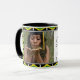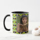 Élégant Mug moderne de Graduation avec texte et photo personnalisables. Un Arrière - plan montre le DRAPEAU DE JAMAÏQUE dans un motif carrelé. Le design affiche l'image de l'espace réservé à gauche et ajoute votre message personnel à droite, ainsi que le texte personnalisable qui se lit à DIEU SOYEZ LA GLOIRE. Bordure noire avec petit motif de finition graduation. Un cadeau idéal pour les diplômés.