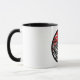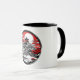 Illustration d'un jardin japonais avec arbres, étang, rochers et une pagode aux couleurs rouge, blanc et noir entouré d'un cercle noir grunge