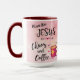 Personnalisez cette Mug Chrétienne unique "One of a Kind" ! Avec des paroles inspirantes comiques... "I Run On Jesus, Chaos and Coffee"... et une magnifique tasse de café chaud entourée de fleurs et de coeurs ! Art graphique original par l'artiste Kerry Miller. Bon appétit !