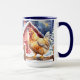 Belle tasse à café sur le thème du coq de Noël avec un poulet à l'aquarelle debout près d'une clôture en bois rustique devant une grange.