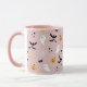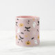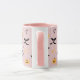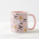 Cute tasse de café avec fantômes d'Halloween fantaisistes, citrouilles, toiles d'araignée et chauves-souris sur un fond rose pâle.