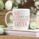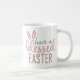 La tasse présente les mots 'Joyeuses Pâques' dans des couleurs pastel discrètes avec une paire d'oreilles de lapin perchées sur le dessus.