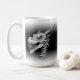 D20 Dragon Skull Illustration d'un artiste indépendant. Il s'agit d'une oeuvre d'art unique et frappante, qui présente un crâne de dragon à l'allure diabolique (avec os de cou) tenant dans ses mâchoires une mort à 20 côtés. Il est prêt à jouer à des jeux de société ! La tasse a un simple arrière - plan dégradé noir et blanc pour montrer l'oeuvre. Cela ferait un grand cadeau d'anniversaire pour un joueur de plateau. Faites-moi confiance... ils adorent les dragons !