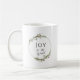 Mug featuring a minimalist watercolor wreath with red floral and green foliage accents. This elegant wreath frames the greeting "Joy to the world". Makes a great gift.