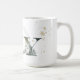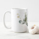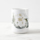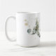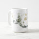 Une tasse de Noël ornée d'aquarelle de forêt boisée peinte en lettres épelées, JOY, avec des flocons d'or.