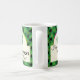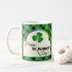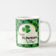Cette tasse de café colorée de la Saint-Patrick comporte un motif de trèfle vert sur fond noir et le texte : Joyeuse Saint-Patrick ! Le texte est sur fond jaune clair accentué de couleurs arc-en-ciel et d'un grand trèfle vert au milieu.